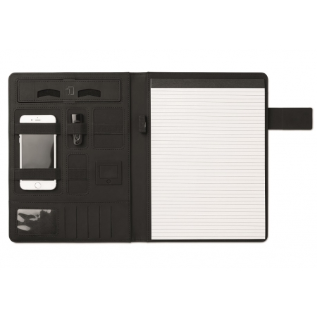 Conférencier A4 en lin PU avec fermeture magnétique incluant un powerbank de 4000 mAh. Connecteur intégré micro USB à type C. Comprend 20feuilles de mémo et plusieurs compartiments internes.