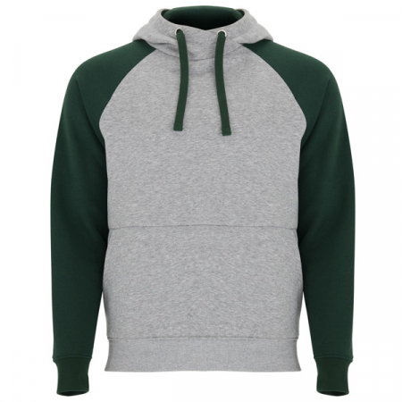 Felpa bicolore unisex. Cappuccio con coletto incrociato e occhielli metallici, interno e cordoncini a contrasto. Manica raglan a contrasto. Tasca a canguro. Polsini e girovita in costina 1x1 con elstan