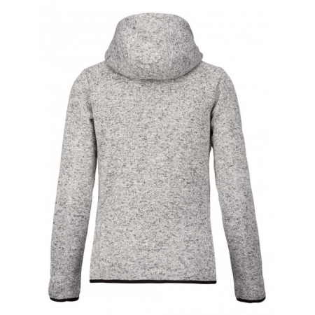 Felpa / giacca da donna in colorazioni melange. Maglia interna garzata 100% poliestere. 2 tasche con zip a contrasto sul davanti e 1 tasca con zip a contrasto sul petto. Cappuccio con fodera a contrasto jersey 100% cotone con coulisse piatta a contrasto. Fondo manica e fondo capo con finitura a sbieco a contrasto elastica. Punto di copertura sui profili. 345gr.