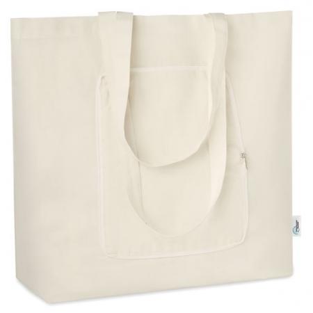 Shopper pieghevole in tessuti riciclati 150 gr / m². 55% RPET e 45% cotone. La borsa include una cerniera che permette di essere ripiegata. Certificato GRS che garantisce il contenuto riciclato di questo prodotto e la verifica di una produzione responsabile a livello ambientale e sociale.
